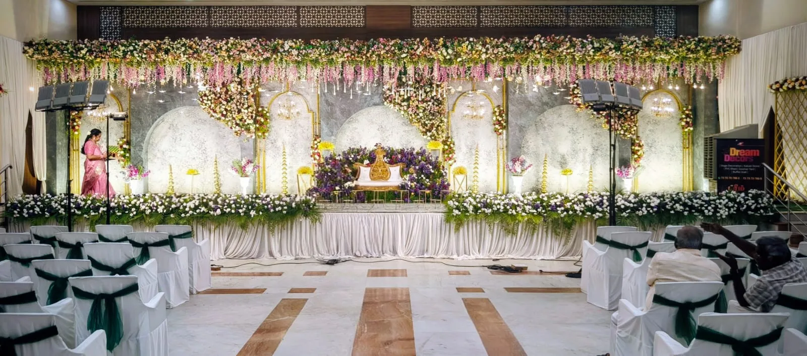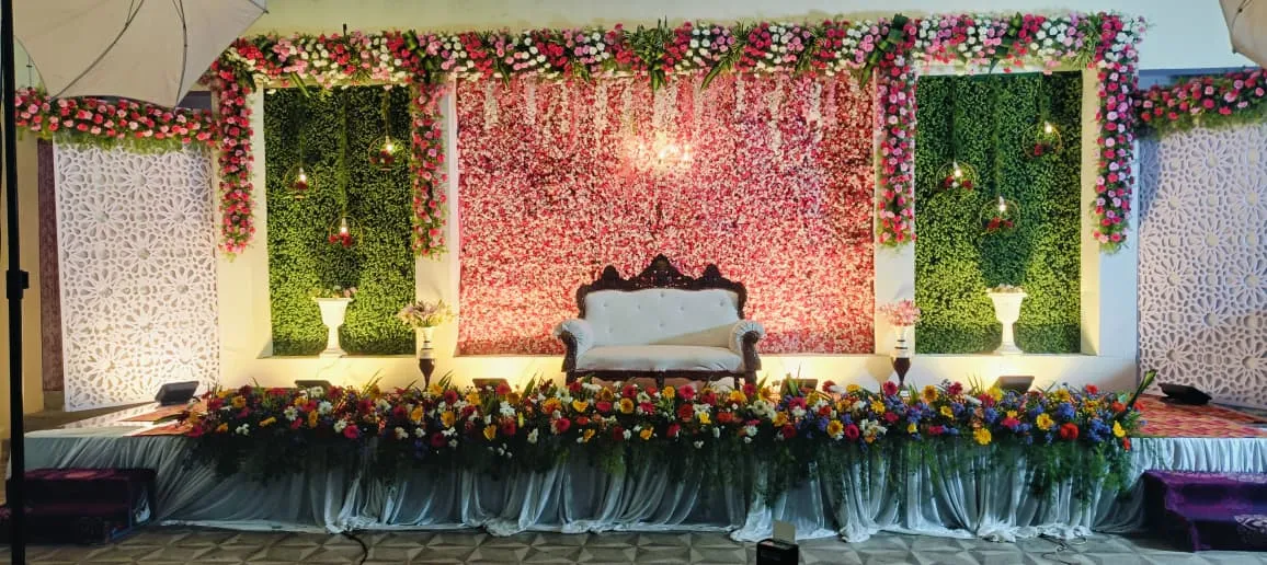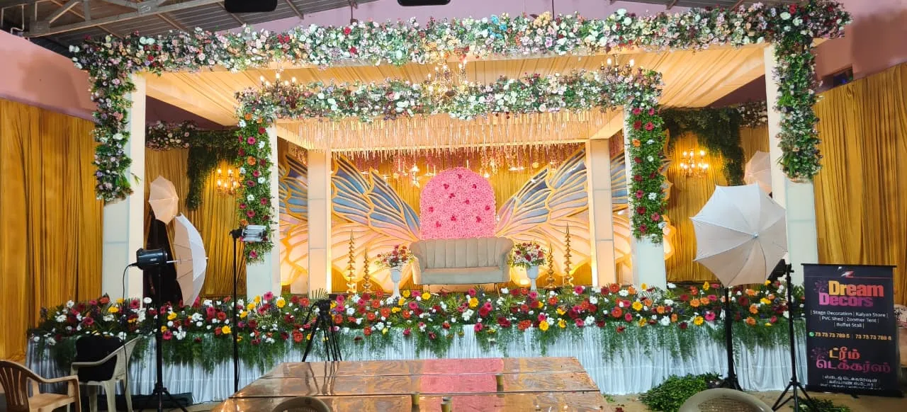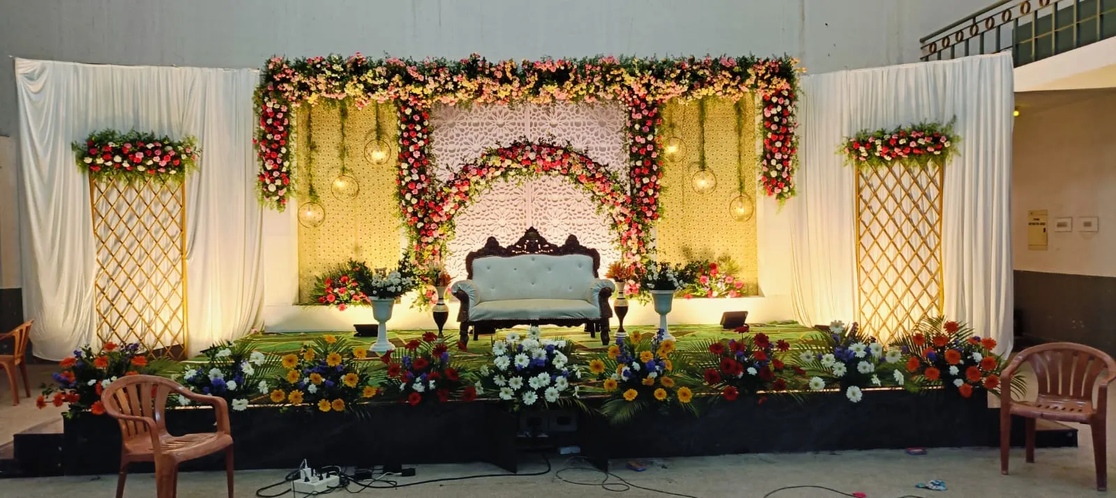 Elegant wedding stage decoration by Dream Decors with floral backdrop