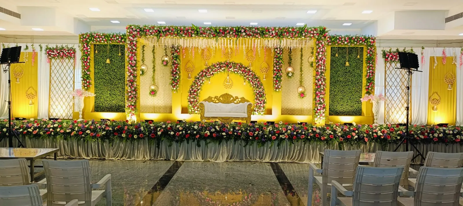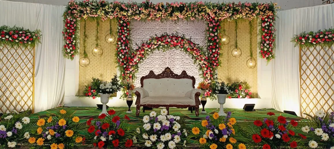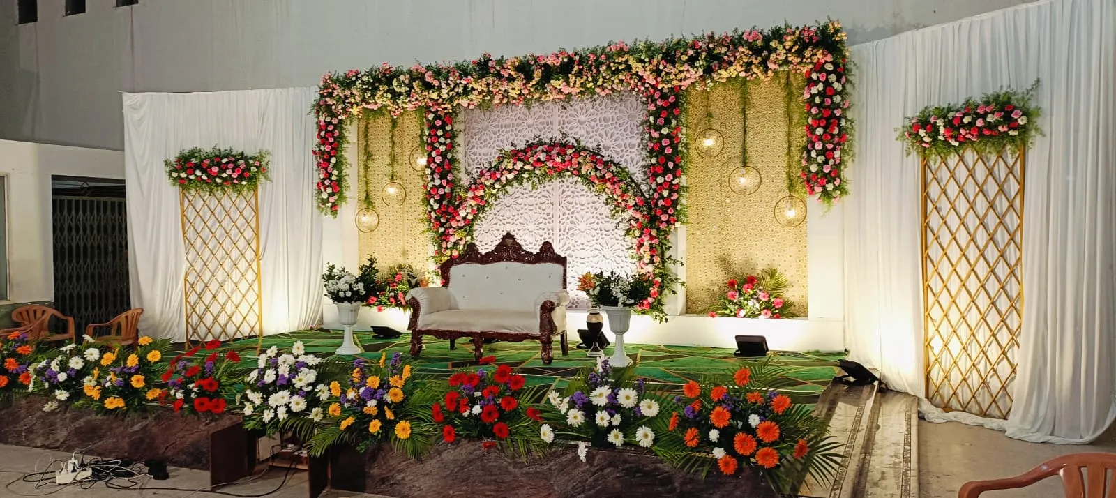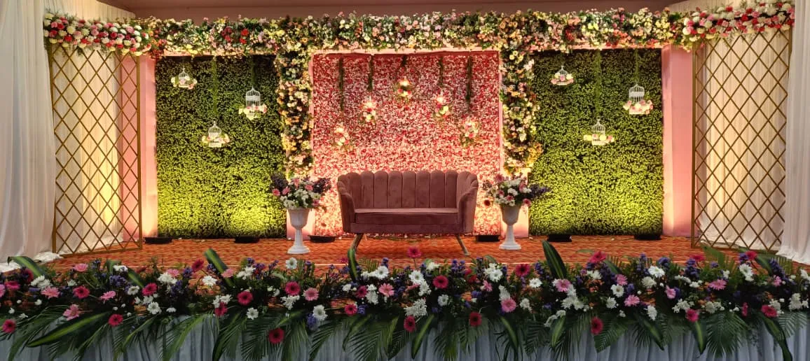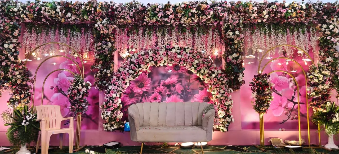 Elegant wedding stage decoration by Dream Decors with floral backdrop